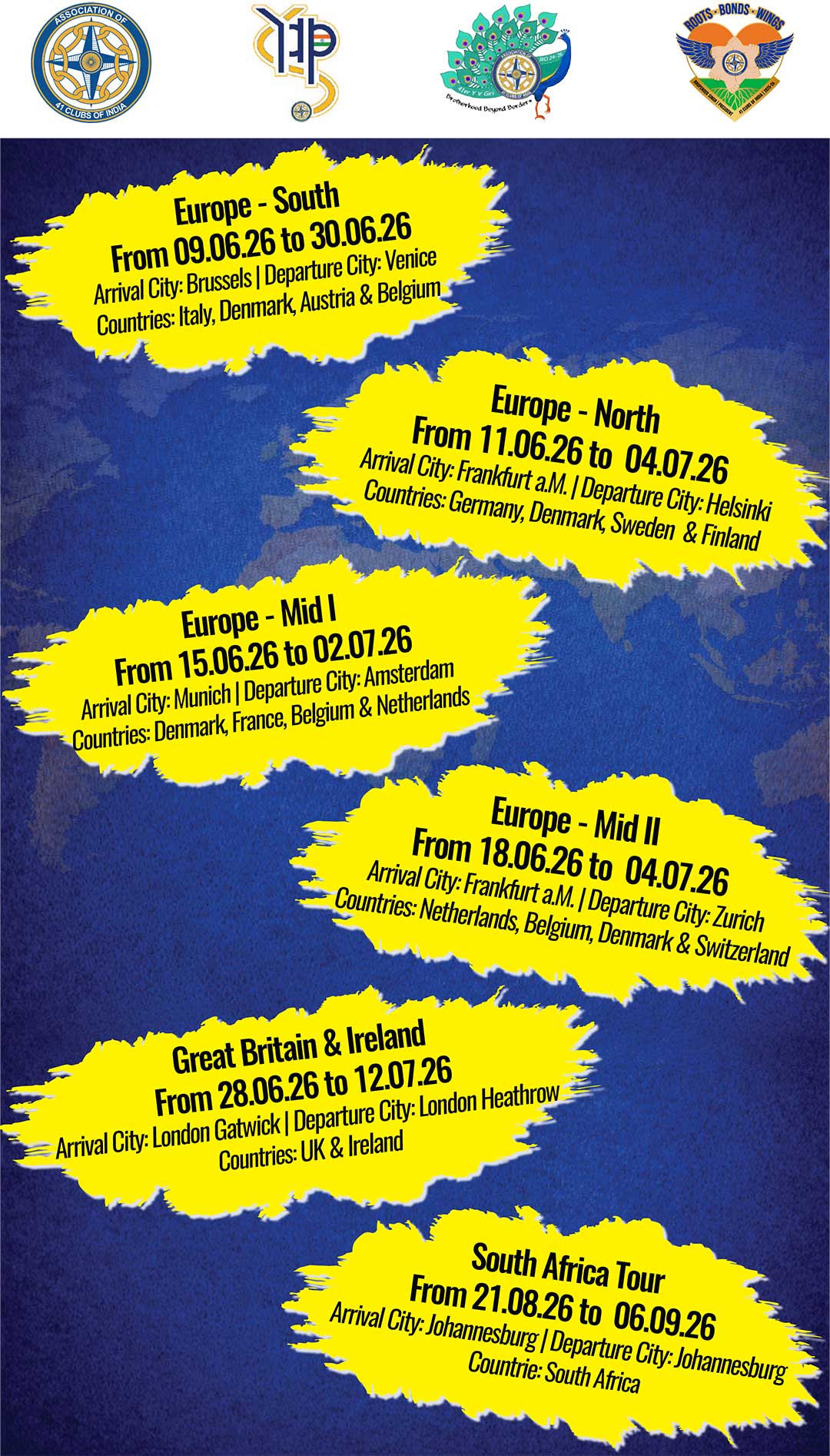 | Europe South Tour | Brussels | Venice | Italy, Denmark, Austria & Belgium | 09.06.26 to 30.06.26 |