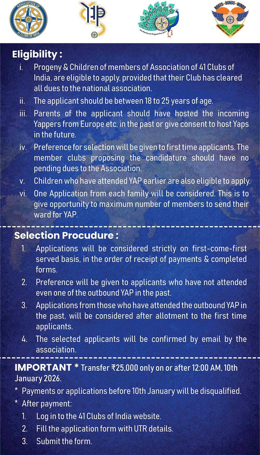 The Young Ambassador Program more popularly known as ‘YAPs’ is a flagship activity of 41 International for the children of the members of 41 clubs all over the world. YAP seeks to promote exchange visits between children groups of India, Europe and other countries. This program gives a great opportunity to the young adults to meet people of various ethnicity, learn foreign cultures and see new places, all of which are a huge learning experience for them.
